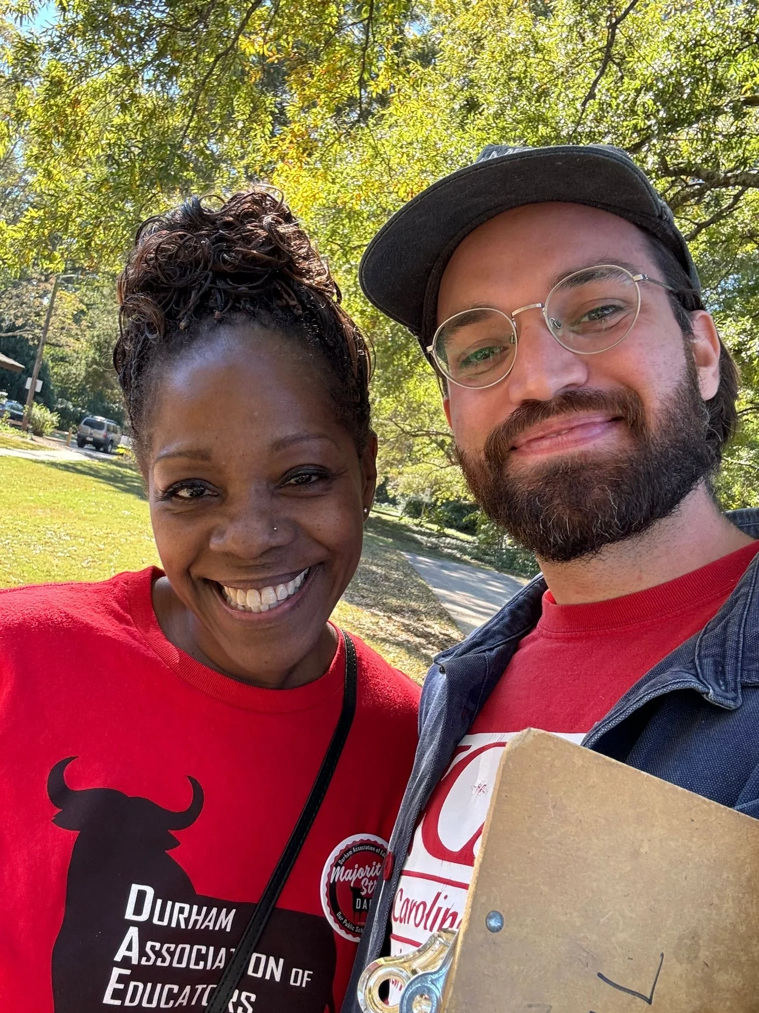 I’ve asked Durham social studies teacher Reilly Finnegan to be my running mate, and to serve as my Vice President if we have the opportunity to lead. Because many of you know me a little better than Reilly, I want to say a few things about him. Reilly is a brilliant, tirelessly hardworking, unsung hero of the Durham Association of Educators’ tremendous growth and successful campaigns, including hitting majority and winning a robust Meet + Confer policy under very tough conditions. He’s a deeply trusted member leader with sharp strategic instincts, and perhaps most importantly, he’s one of the architects behind Durham’s organizing committee, a model collaborative decision-making structure that really takes member democracy to the next level. He has skillfully managed countless relationships, helping build a tent so big, yet so disciplined, that thousands of workers have taken high stakes collective action together towards shared goals, over and over again, even in the face of great opposition. Lastly, he’s a joy to work with and a great thought partner. Local leaders from Murphy to Manteo should have the opportunity to know and learn from Reilly, and he should have the chance to learn every detail of your local context so he can contribute to more victories across our state.